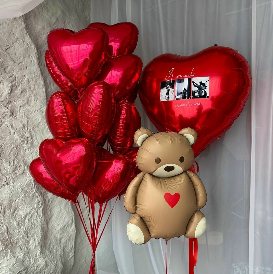 связка: 15 сердец на атласных лентах мишка барни большое сердце с вашими фото и надписью