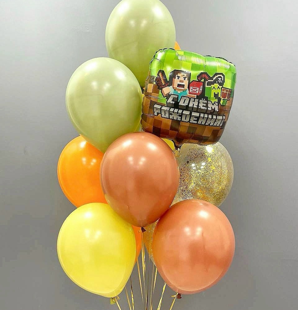 Связка: 2 шара кофе 2 желтых шара 3 оранжевых шара 2 шара эвкалипт 2 шара с конфетти золото Фигура квадрат с рисунком
