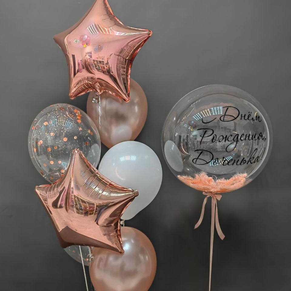 Связка из: 2 звезды, 2 перламутровых шара, 1 цветной шар, 2 конфетти, грузик.
