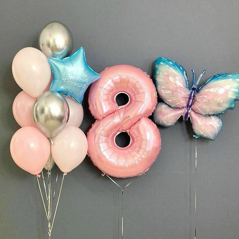 связка : 3 хром серебро шара, 3 розовых шара, 3 нежно розовых шара, 1 звезда с надписью.