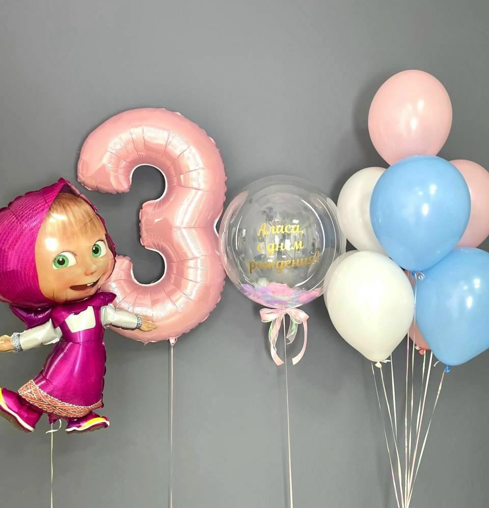 Связка: 8 цветных Шаров Баблс с перьями и надписью Цифра (на выбор) Фигура маши
