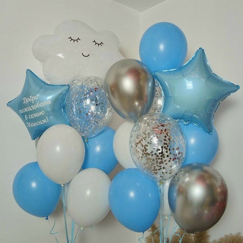 Связка из: Облако, 7 цветных шаров, 1 шар с конфетти, звезда с надписью, грузик.