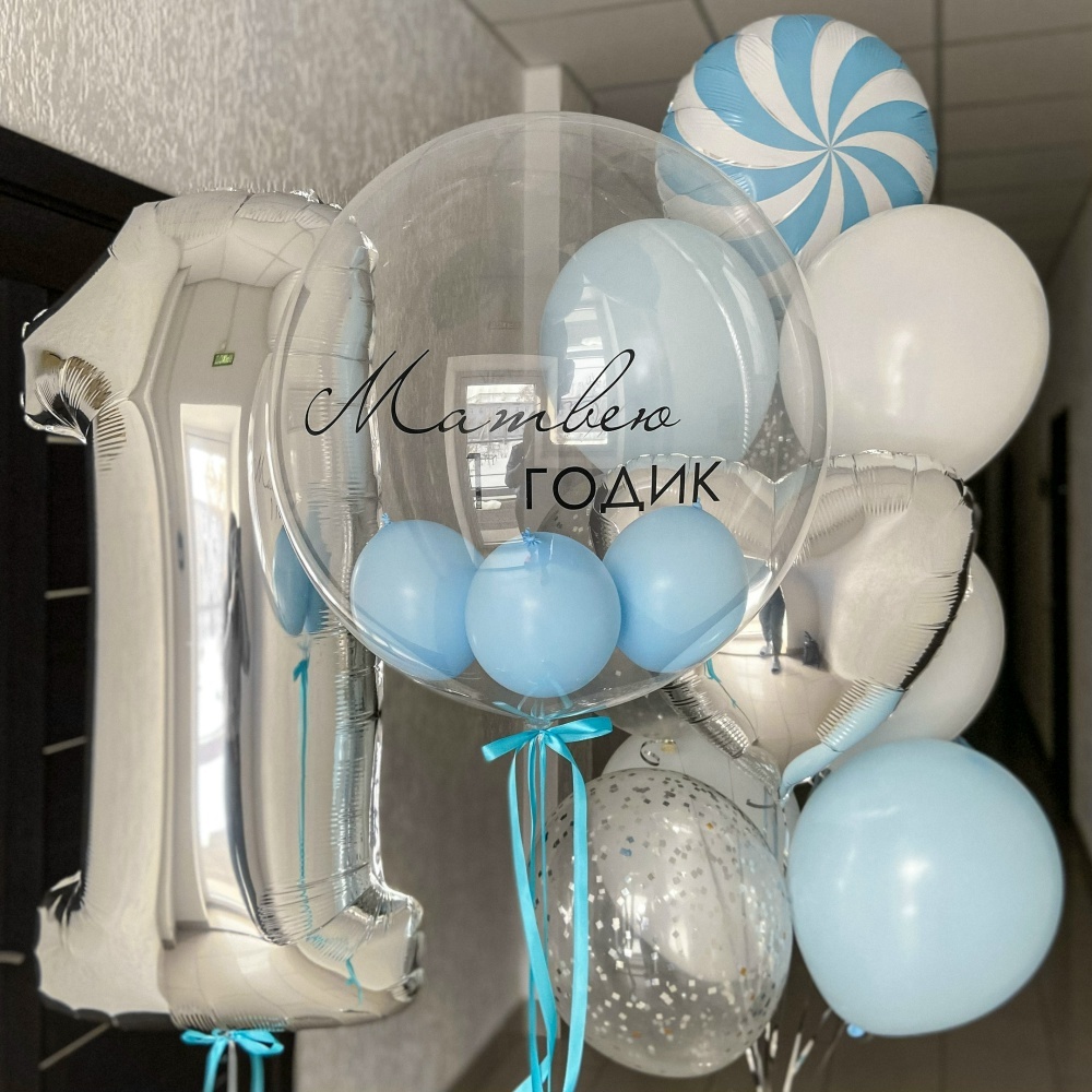 Цифра, грузик. Шар баблс с надписью,грузик. Связка из:2 карамельки, 3 шара с конфетти, 3 белых шара, 2 голубых шара, 1 сердце, грузик.