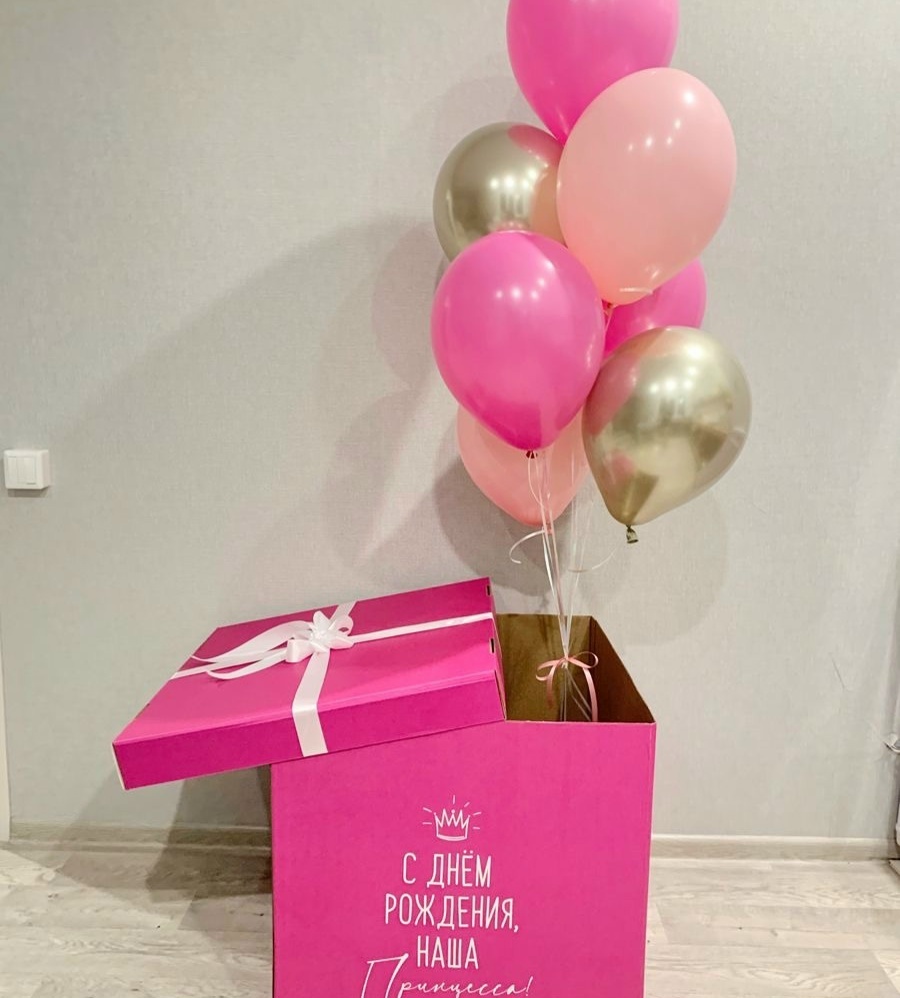 Связка: 3 фуксия, 2 розовых, 2 золотых шара Коробка с надписью