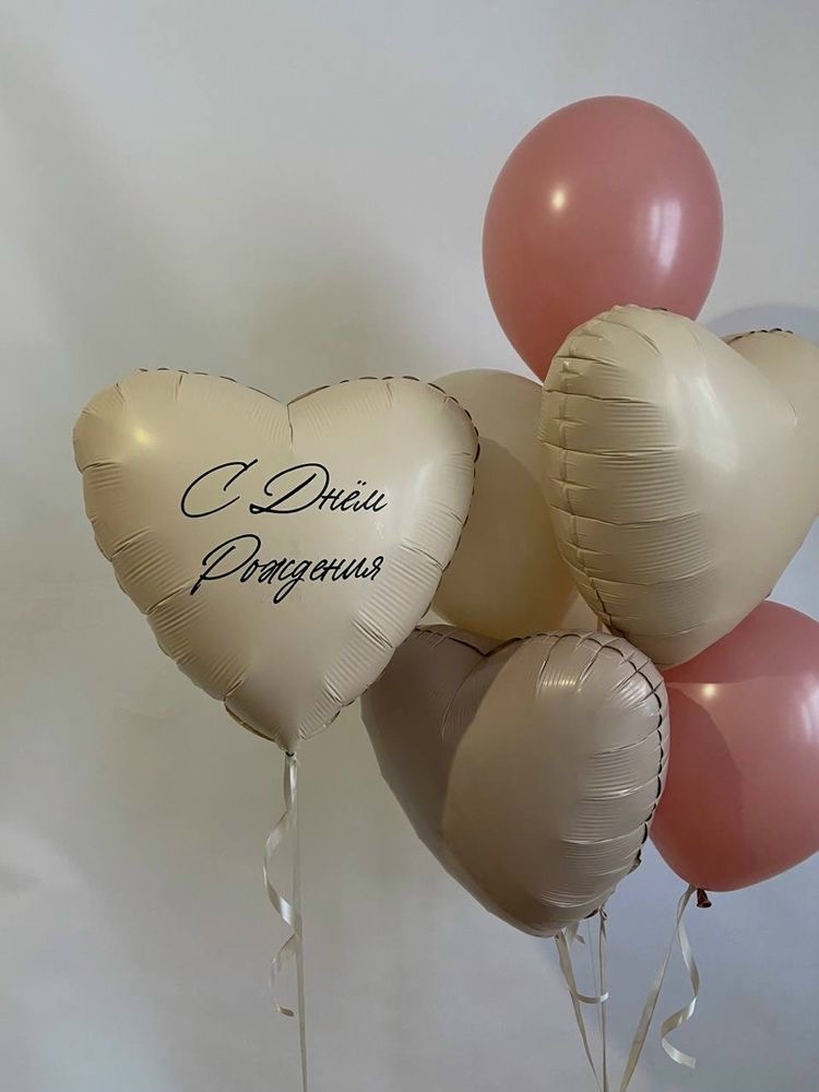 Связка из: 2 сердец, 5 цветных шара,грузик. Шар сердце с надписью, грузик.