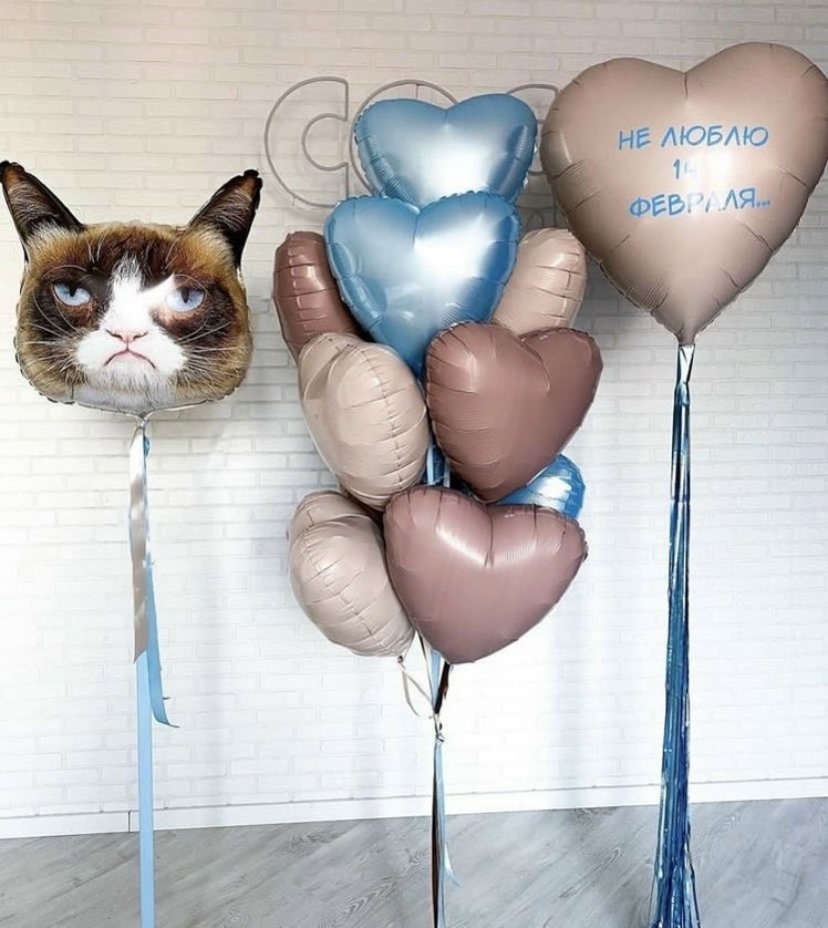 Связка из 11 сердец,грузик. Шар сердце с надписью и грузик. Шар угрюмый кот,грузик.