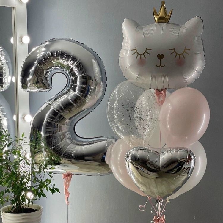 Связка из: 4 цветных шара, 1 шар с конфетти, 1 сердце серебро, кошечка с короной,грузик. Цифра,грузик.