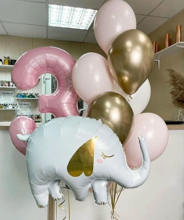 Связка из 8 цветных Шаров, 2х Шаров хром, грузик. Слоник, грузик. Цифра,грузик.