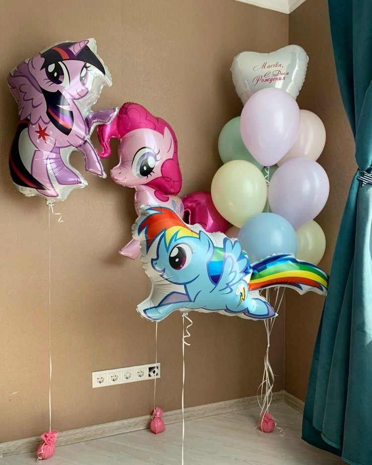 Связано из: 9 цветных Шаров, 1 сердце с надписью. 3 фигуры пони с грузиками.