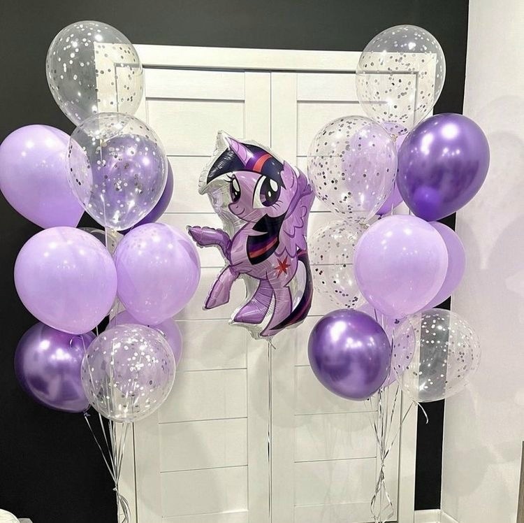 2 связки из:4 цветных шара, 2 шара хром, 4 шара с конфетти, грузик. Фигура пони, грузик.