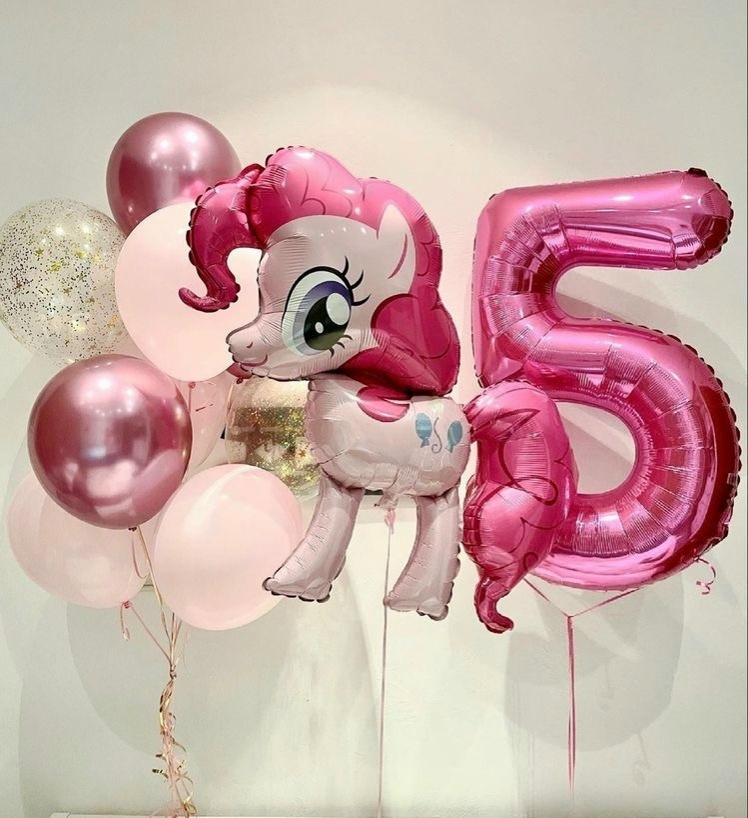 Связка из: 6 цветных Шаров, 2 шара хром, 2 шара с конфетти, грузик. Фигура пони,грузик. Цифра, грузик.