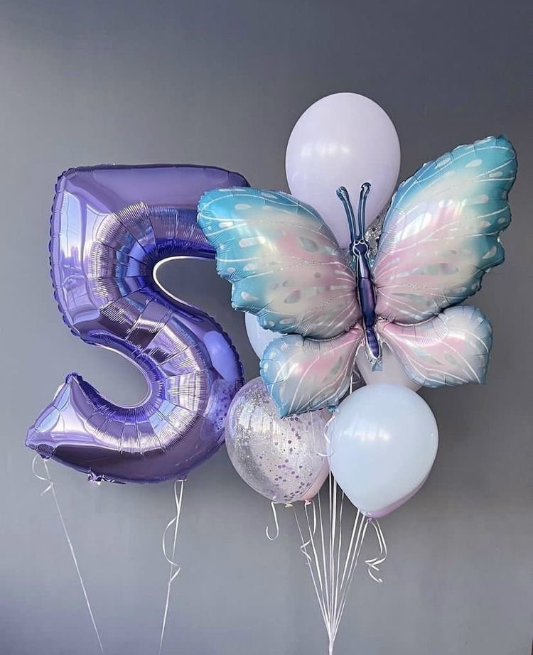 В набор входит: Связка из 6 цветных Шаров, 3 шара конфетти, грузик. бабочка Цифра,грузик.