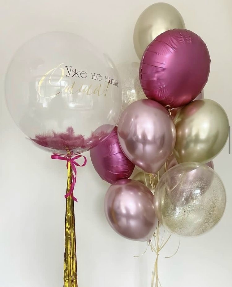 В набор входит: Связка из 7 Шаров хром, 2 шара с конфетти, 2 круга, грузик. Баблс с перьями, надписью и кисточкой из дождика, грузик.