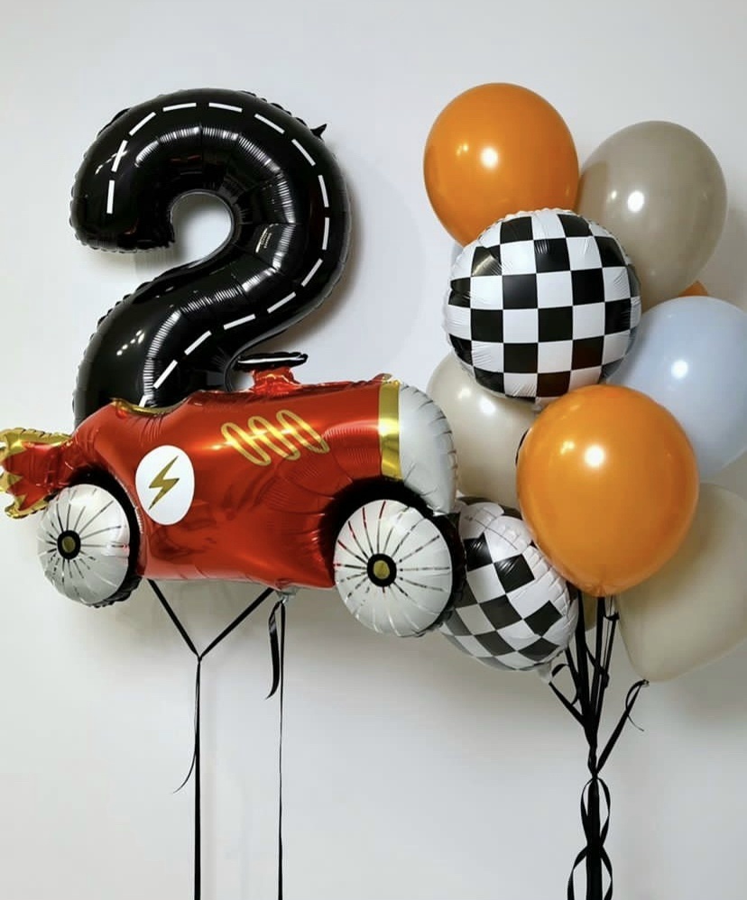 В набор входит: Связка из 9 цветных шаров, 2 круга с рисунком,грузик. Машина фигура, грузик. Цифра с полосами дороги, грузик. (Цифра может быть любая)