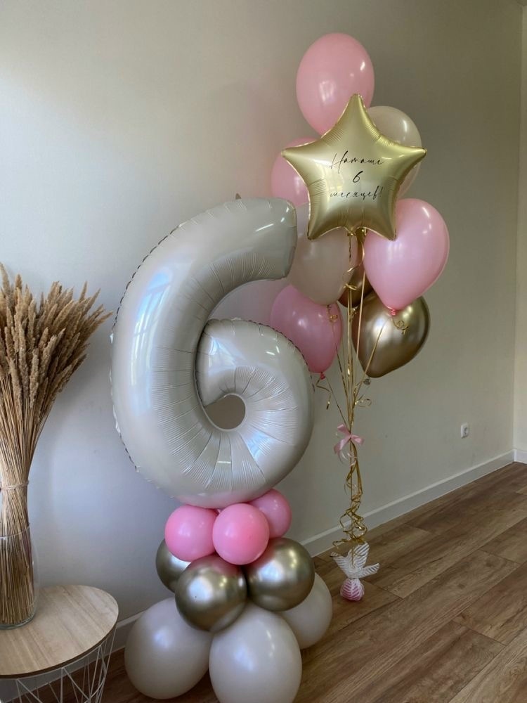 В набор входит: (Любая) цифра на стойке. Связка из 6 цветных Шаров, 2 шара хром золото, 1 звезда золотая Сатин с надписью,грузик.