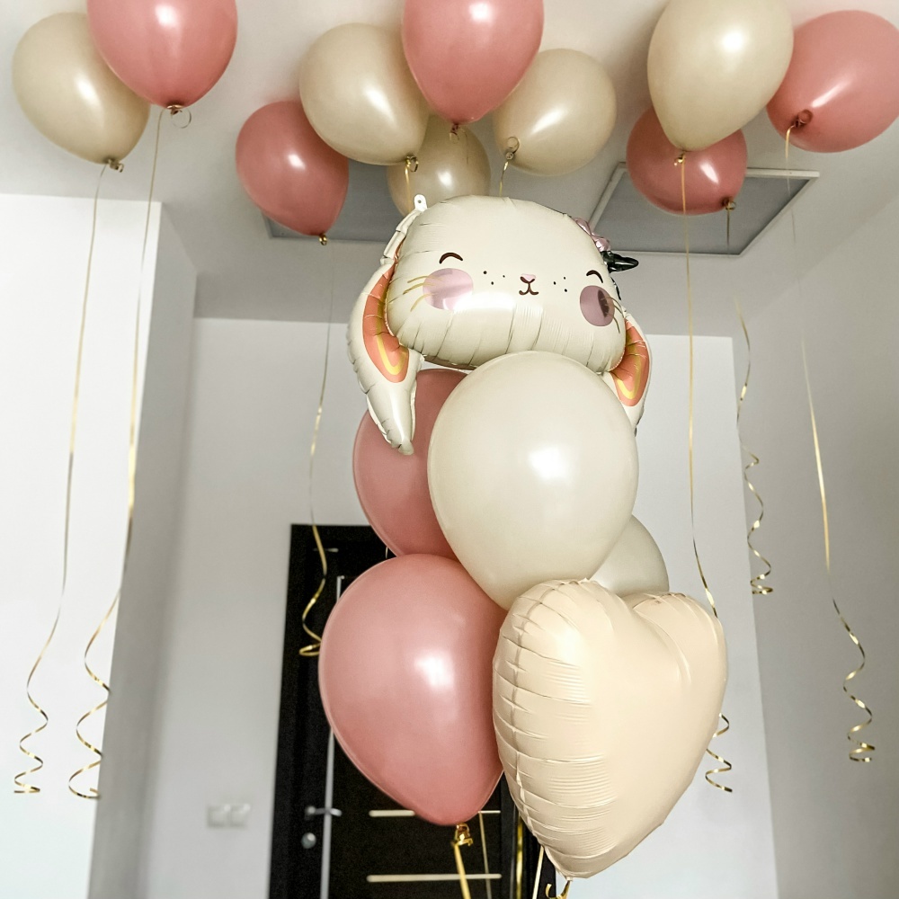 В набор входит: Фонтан из: 4 цветных шара, 1 сердце, зайка,грузик. 10 цветных Шаров в потолок( ленты заменить на дождик +300р)
