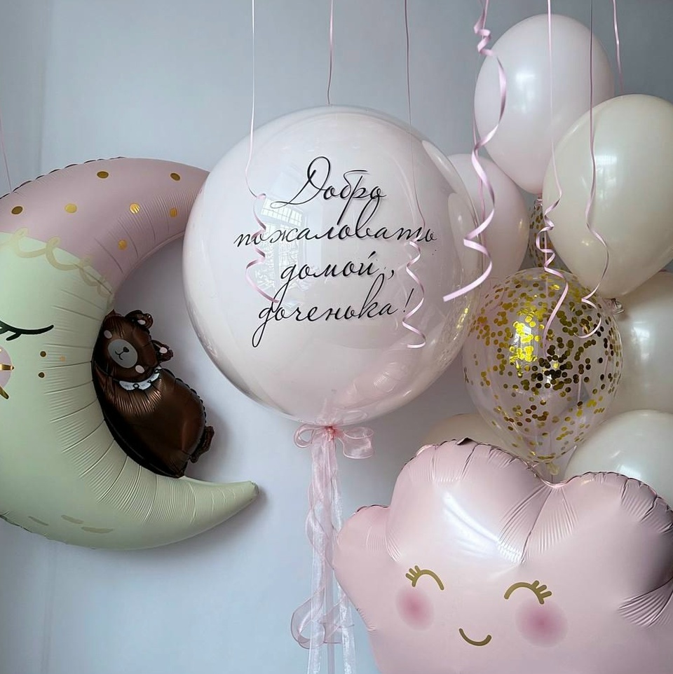 связка: 4 бежевых шара 4 нежно розовых шара, 2 шара с конфетти шар гигант зеркальный с надписью, фигура месяц с мишкой, фигура облако 10 шаров в потолок (5 бежевых шаров, 5 нежно розовых шаров)