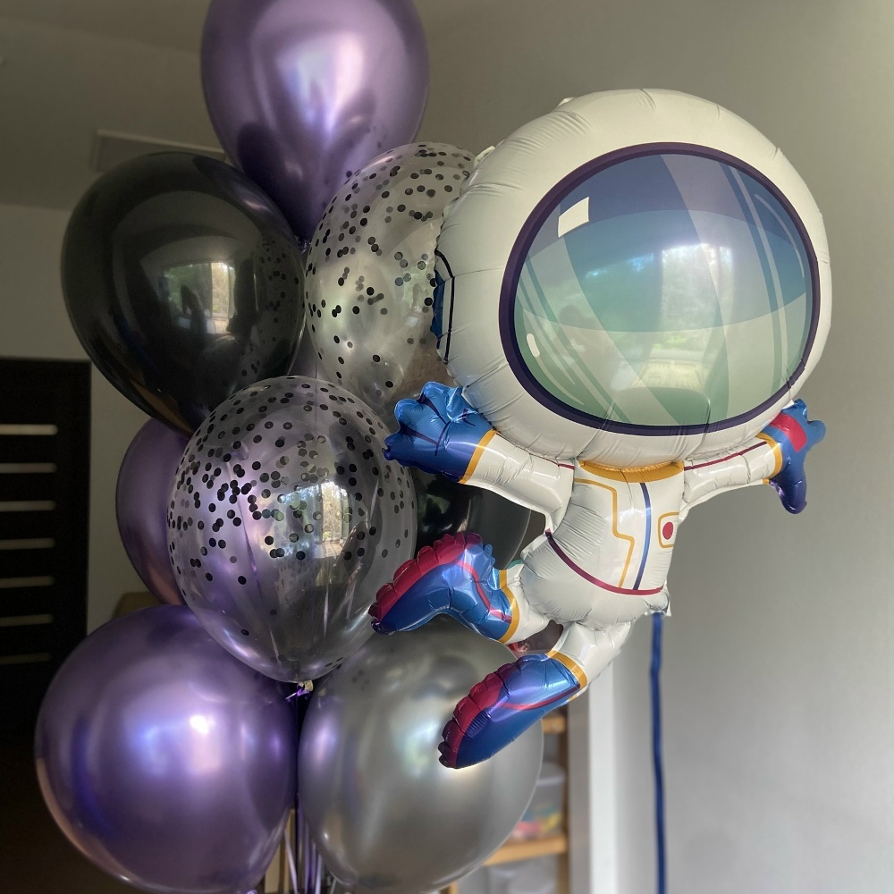 В набор входит: 3 фиолетовых хром шара, 2 серебряных хром шара, 3 черных шара, 2 шара с конфетти, грузик. Фигура космонавта.