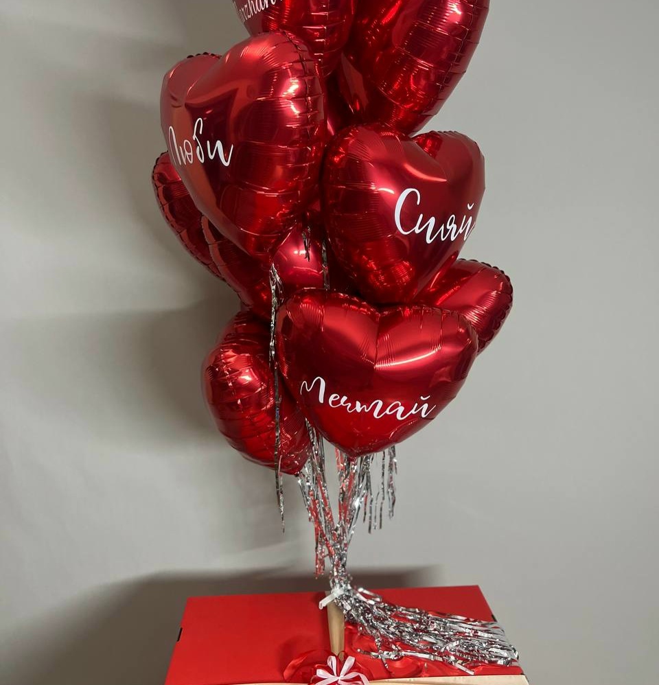 В набор входит: 10 сердец на дождике( без надписей) Коробка 60*60 см с индивидуальной надписью. Надпись на один шар-150р❤️