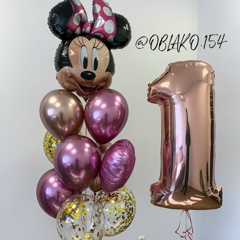 в набор входит : связка из 5 хром шаров, 4 конфетти, 1 сердце, минни маус.