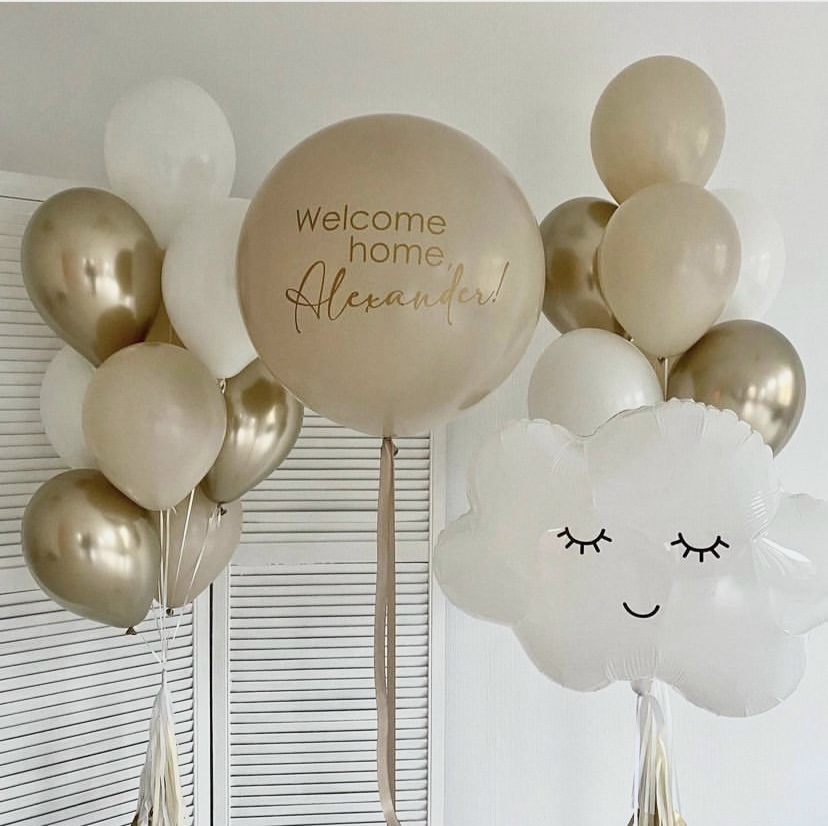 В набор входит: 2 связки из 6 цветных Шаров, 3 Хром Шаров золотых, грузик. Шар гигант с надписью (любая) Облако на грузике.