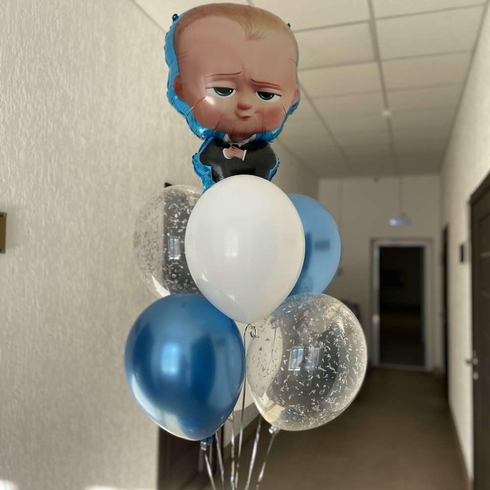 Фонтан: 2 белых шара, 2 голубых хром шара, 2 шара с конфетти, фигура босс-молокосос💙