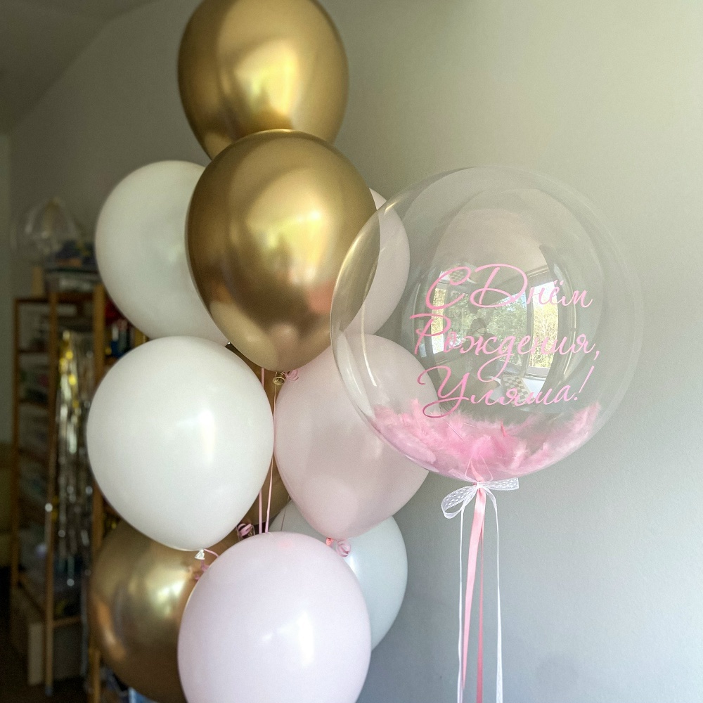 В набор входит: Связка из: 3 белых шара, 3 розовых шара, 4 Хром золото. Шар баблс с перьями и надписью💞