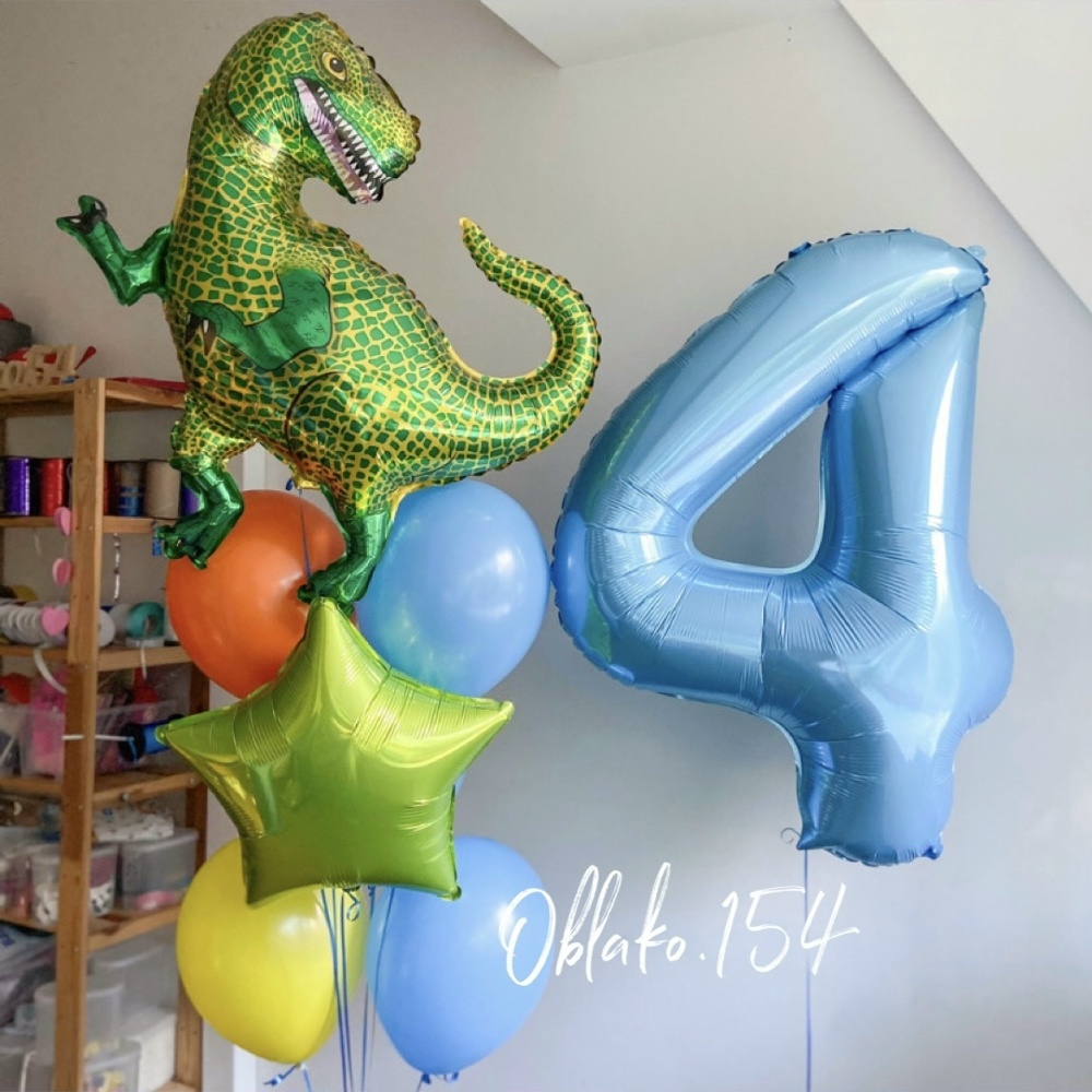В набор входит: Цифра на выбор Связано из 5 цветных Шаров, 1 звезды, фигура динозавра🦖