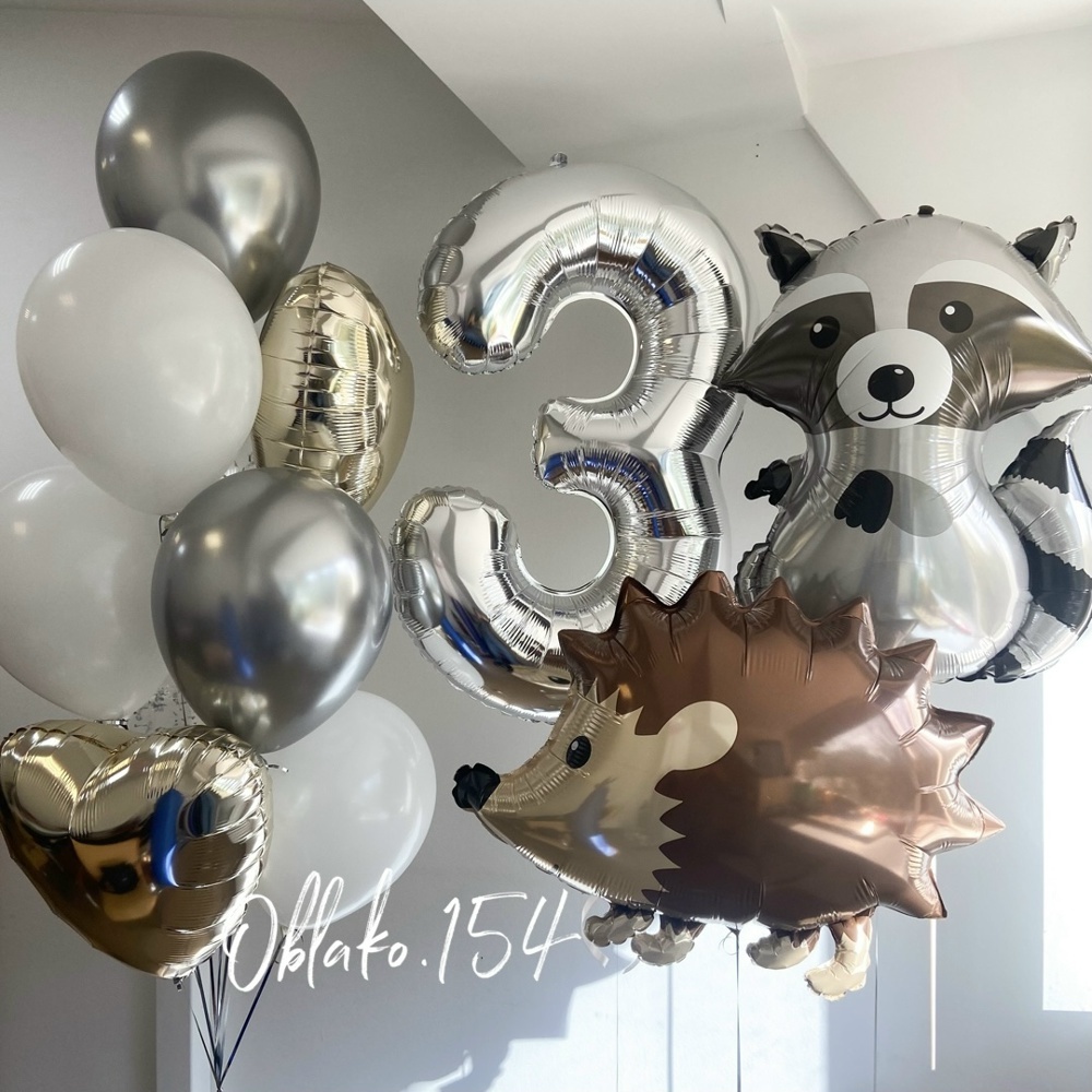В набор входит: Цифра (на выбор) Фигура енота Фигура ежика Фонтан:3 белых шара, 2 серебряных шара, 2 шара с конфетти серебряными, 2 сердца шампань❤️