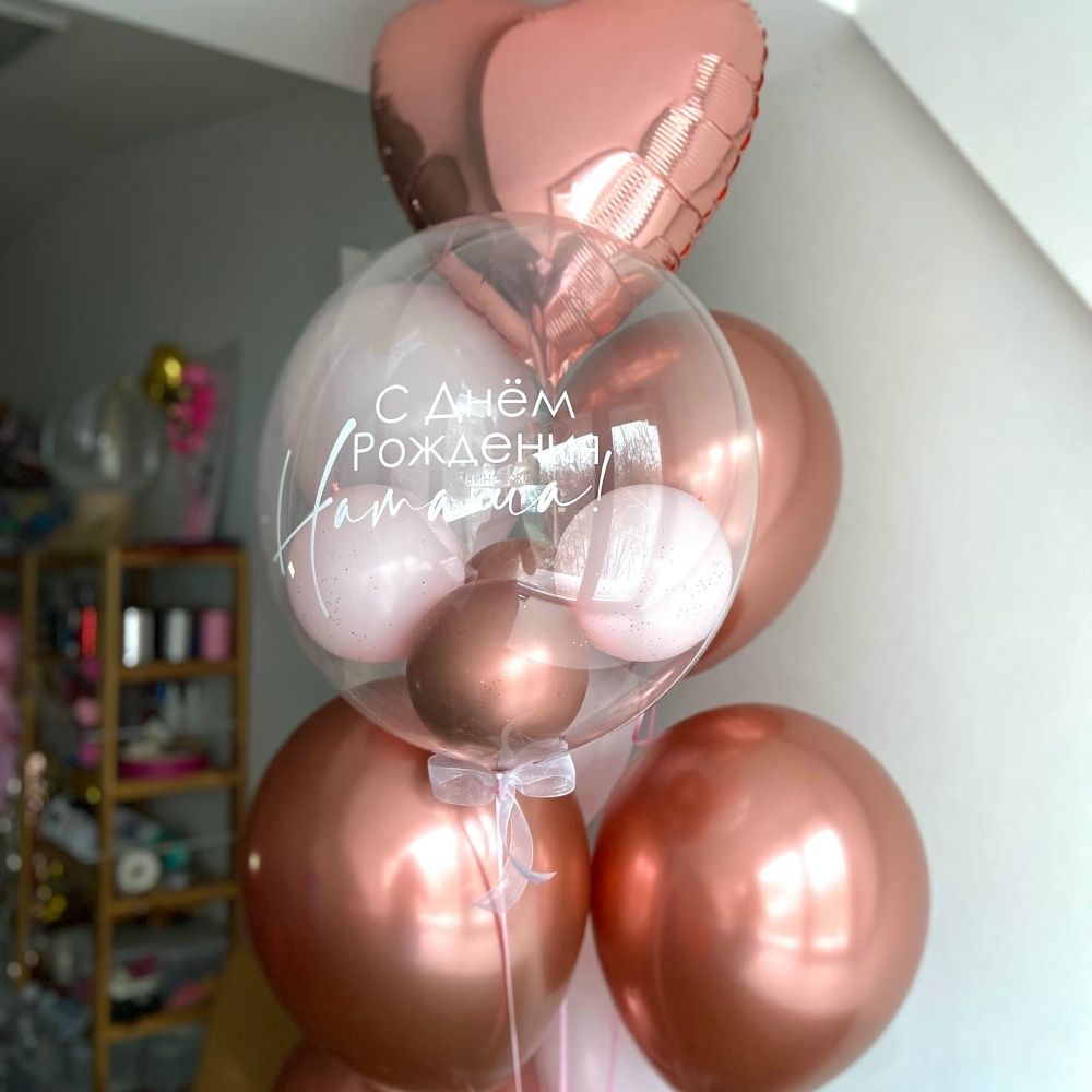 Фонтан: 4 шара розовое золото, 3 розовых шара, большой баблс с шарами внутри и сердце