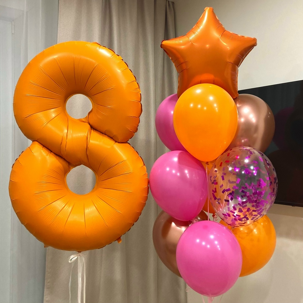 В набор входит: Фонтан из 6 цветных Шаров, 2 Шаров хром, 1 шара с конфетти и 1 звезды. Цифра ( на выбор)