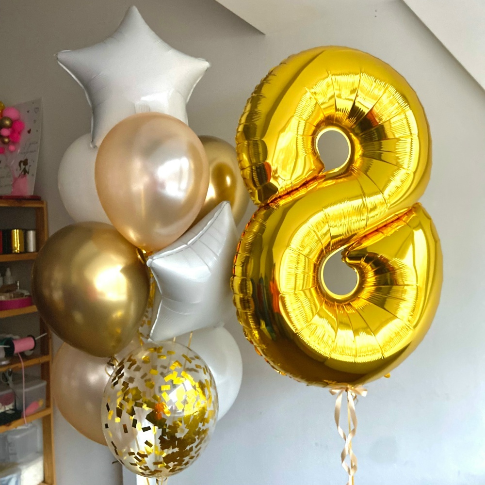 В набор входит: Фонтан из:2 Хром Шара, 2 перламутровых Шара, 2 Шара с конфетти, 2 латексных шара, 2 звезды. Цифра (на выбор)