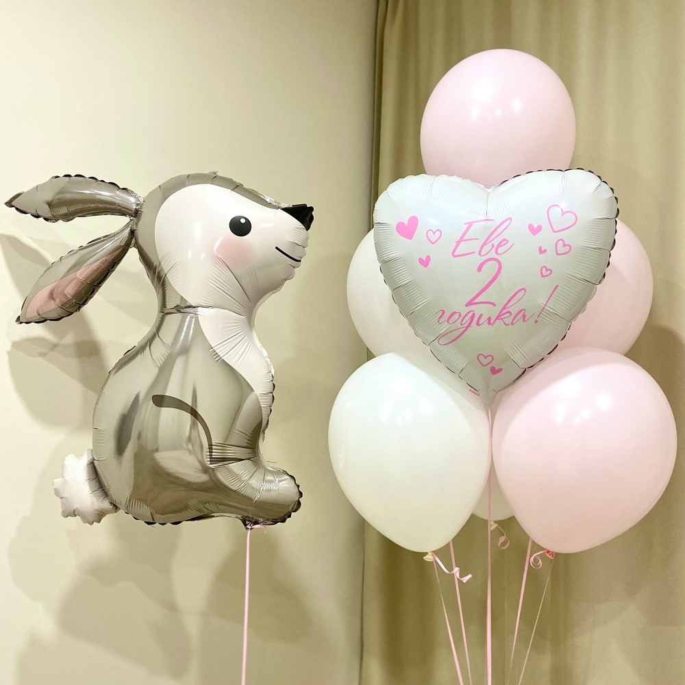 В набор входит: Фонтан из 6 цветных Шаров и сердца с надписью Фигура зайчика