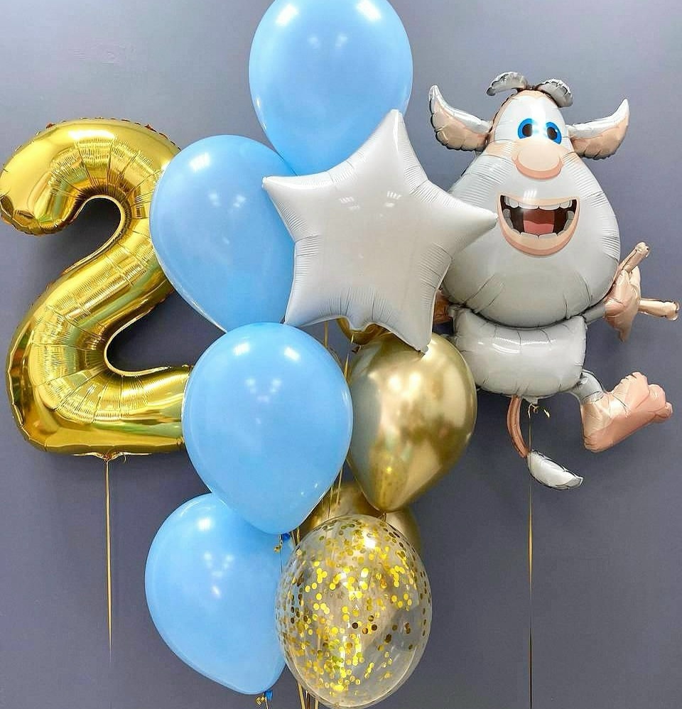 Связка: 4 голубых шара 2 шара с конфетти 3 золотых шара 1 звезда белая Фигура дуба Цифра (на выбор)