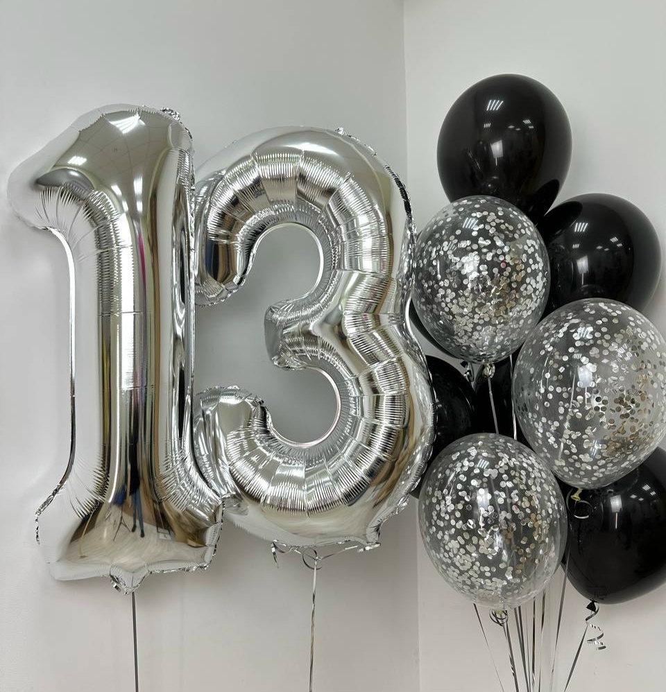В набор входит: Фонтан (7 черных Шаров, 3 шара с конфетти) 2 Цифры (на выбор)