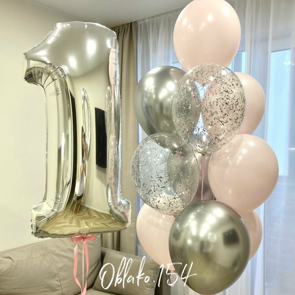 В набор входит: Цифра на выбор Фонтан из 5 розовых Шаров, 3 шара хром, 2 шара с конфетти