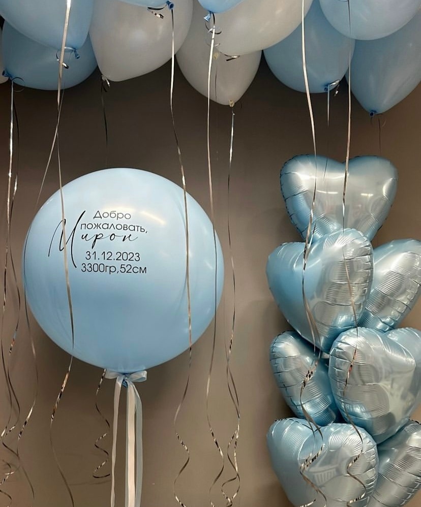 В набор входит: 10 Шаров в потолок ( белые и голубые) Шар гигант с надписью Фонтан из 7 сердец