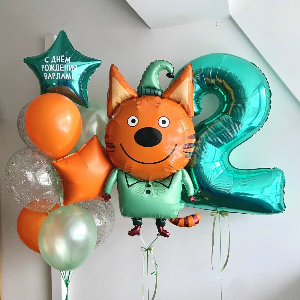 2 перламутровых зеленых шара, 2 оранжевых шара, 1 мятный шар, 3 шара с конфетти, 1 звезда, 1 звезда с надписью