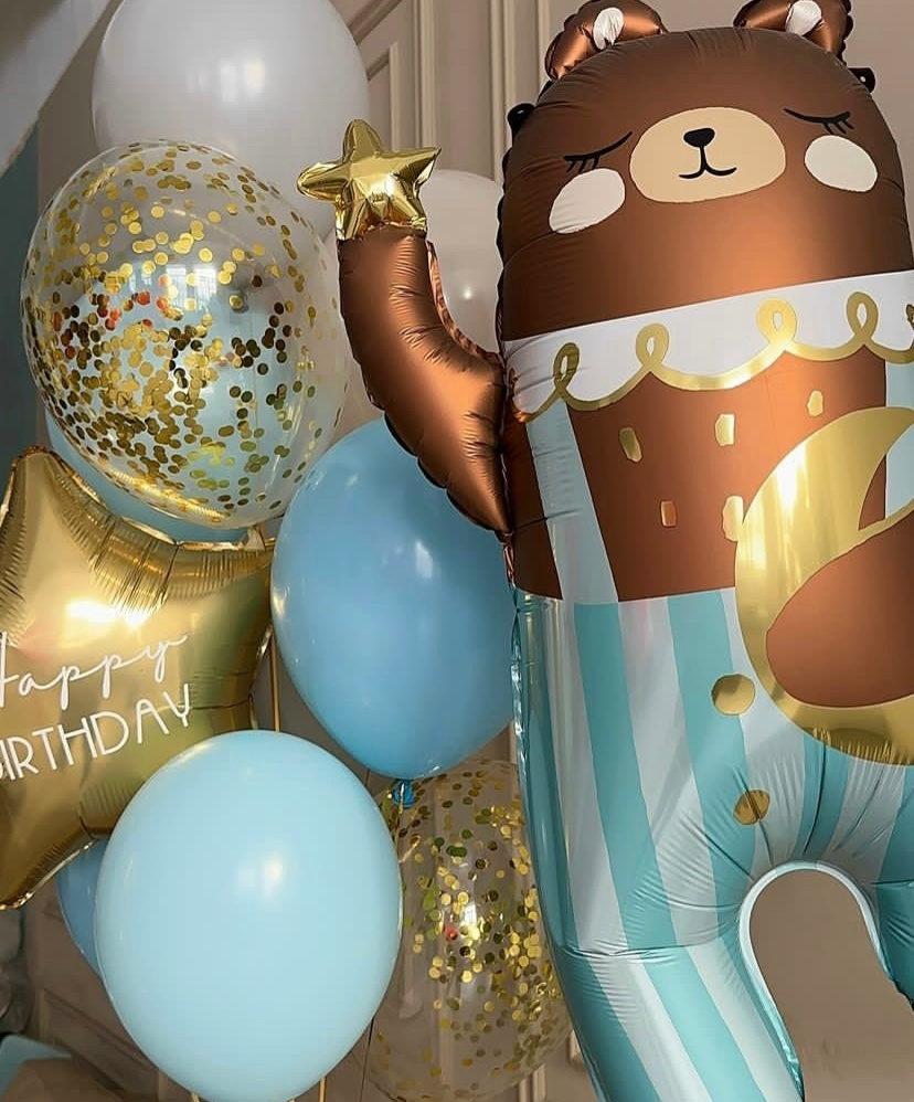 В набор входит: Фонтан из-7цветных Шаров, 2 шара с конфетти, 1 звезды с надписью Фигура мишки