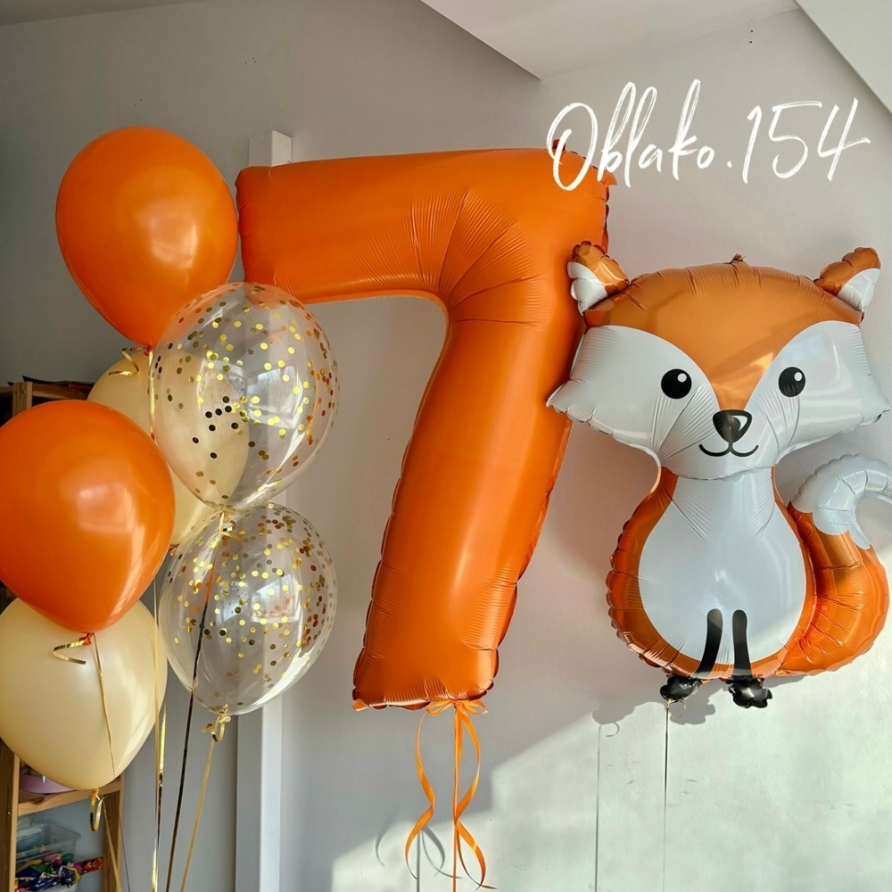 В набор входит: Цифра ( на выбор) Фигура лисички Связка из:4 цветных Шаров, 2 Шаров с конфетти