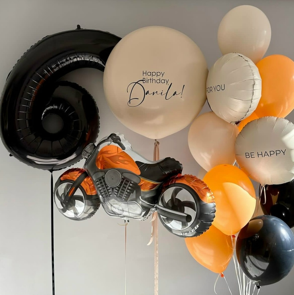 В набор входит: Связка из 10 цветных Шаров, 2х кругов с надписью (можно сделать любую) Шар гигант с надписью Фигура мотоцикла Цифра(на выбор)