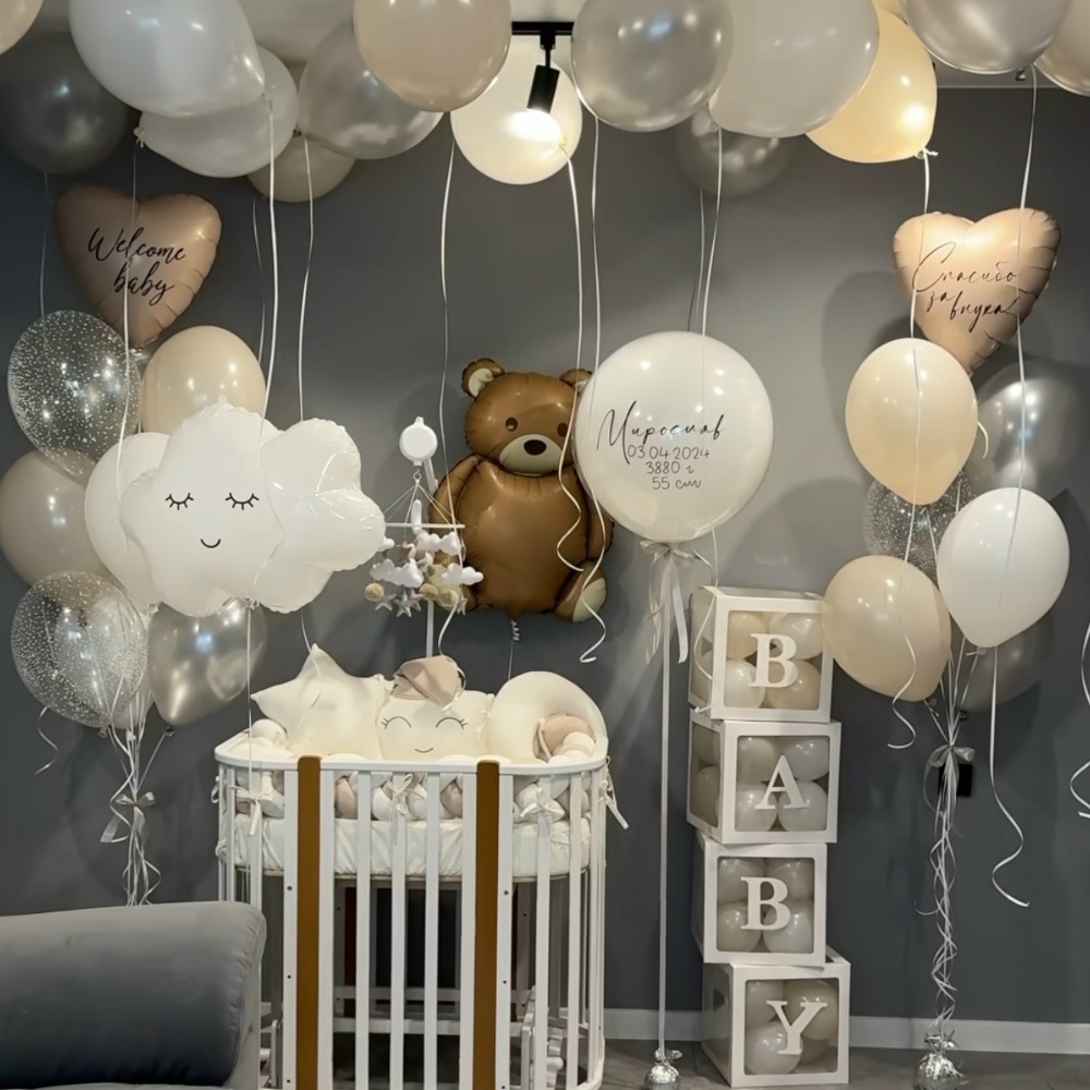 Связка из: 1 сердца с надписью, 2 хром шара, 2 бежевых шара, 1 белый шар