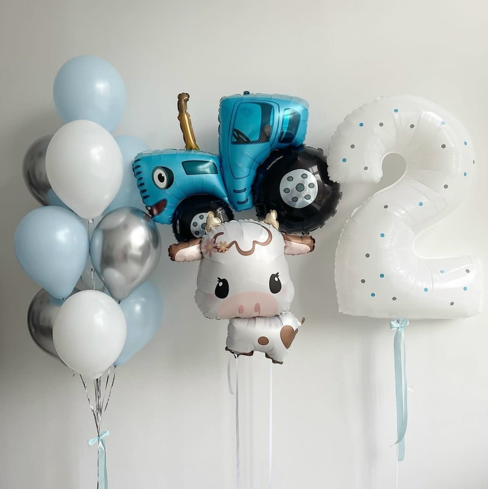 В набор входит: Связка из 10 Шаров (3 хром, 7 цветных) Фигура синего трактора Фигура коровки Цифра ( на выбор) в горошек