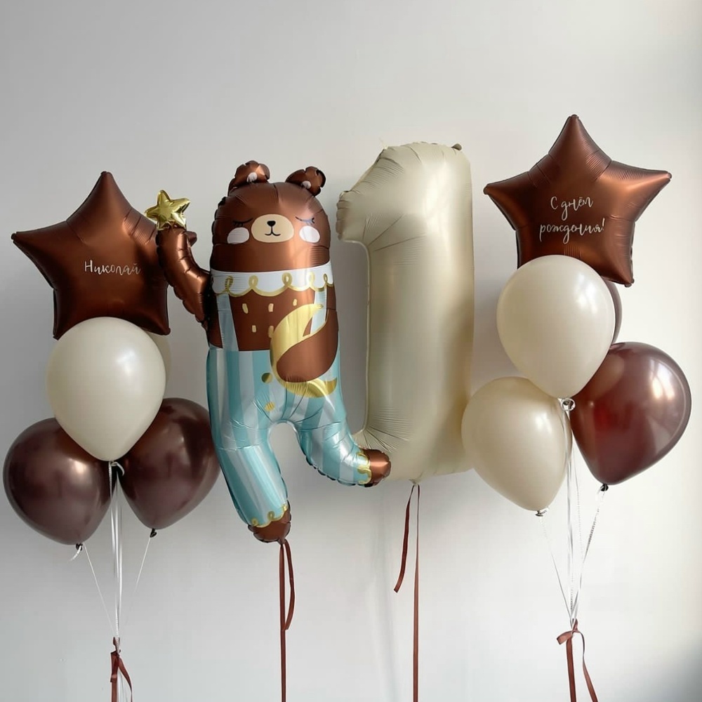 В набор входит: 2 связки из: 2 коричневых Шаров, 2 бежевых Шаров, 1 звезды с надписью Цифра(на выбор) Фигура мишки в костюме (Уточняйте наличие)