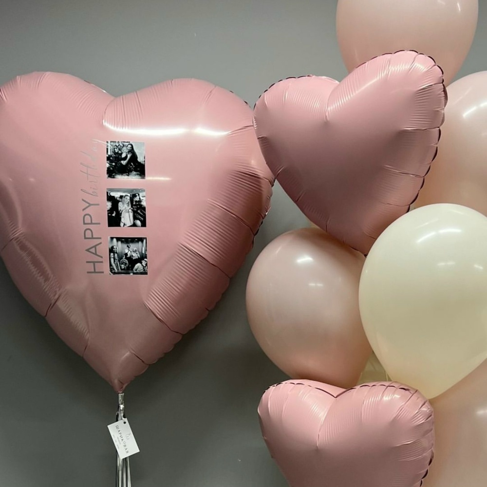 В набор входит: Сердце с вашими фото и надписью Связка из: 8 цветных Шаров, 2 сердец