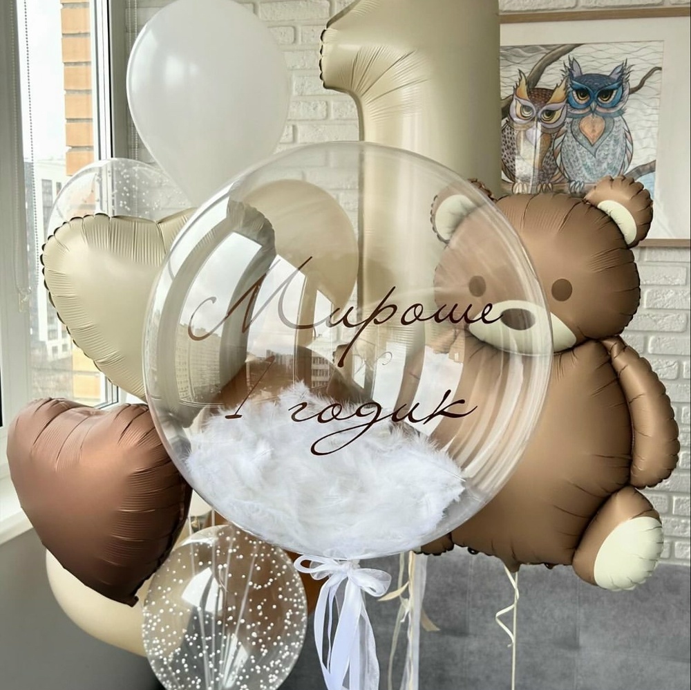 В набор входит: Цифра на выбор Фигура мишки Баблс шар с перьями и надписью Связка из: 6 цветных Шаров, 2 Шаров с пенопластом , 2 сердца