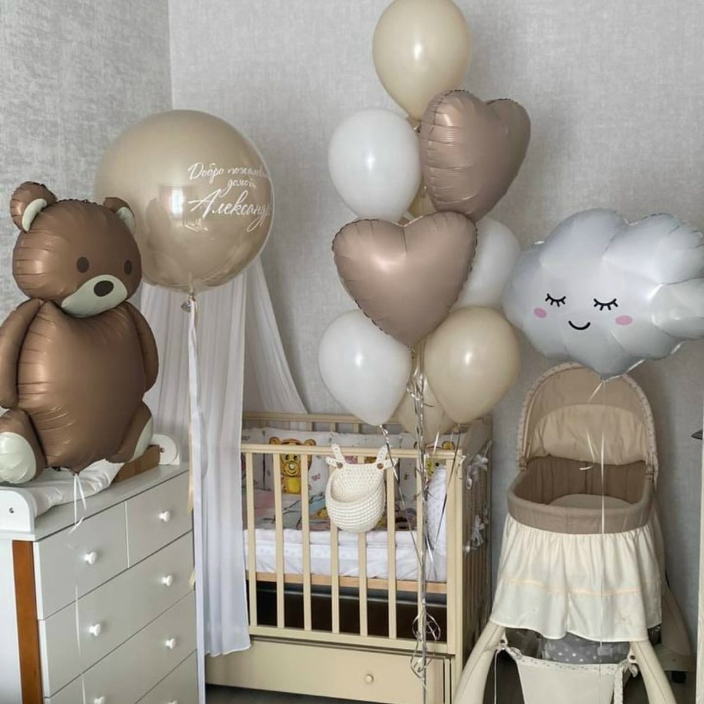 В набор входит: Фигура мишки Фигура облака Стеклянный шар (60см) с надписью Связка Шаров (8 цветных, 2 сердца?