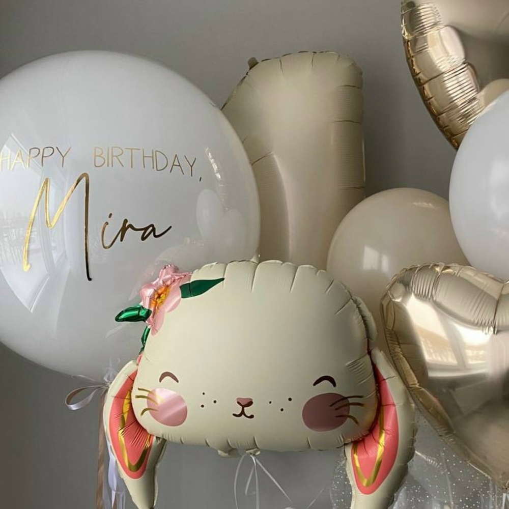 В набор входит: Стеклянный шар гигант с надписью Цифра ( на выбор) Фигура зайки Связка Шаров (2 сердца, 2 белых, 2 бежевых, 2 с пенопластом)