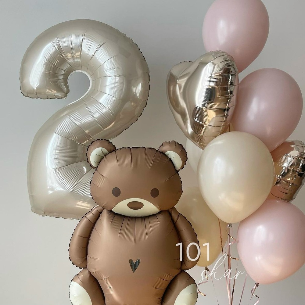 В набор входит: Связка из 6 цветных Шаров, 2 сердец Цифра ( на выбор) Фигура мишки барни