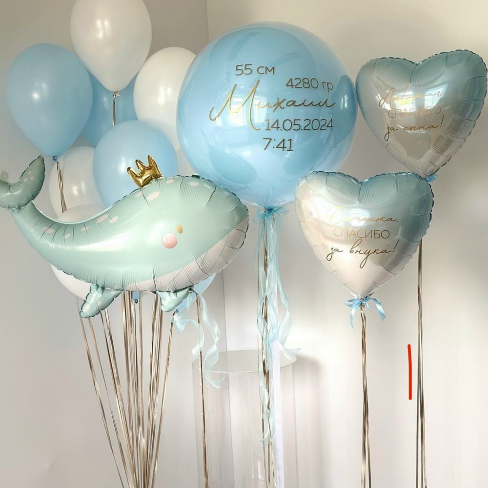 В набор входит: 10 шаров с дождиком в потолок Фигура кита Шар гигант (60см) двойной с надписью 2 сердца с надписями